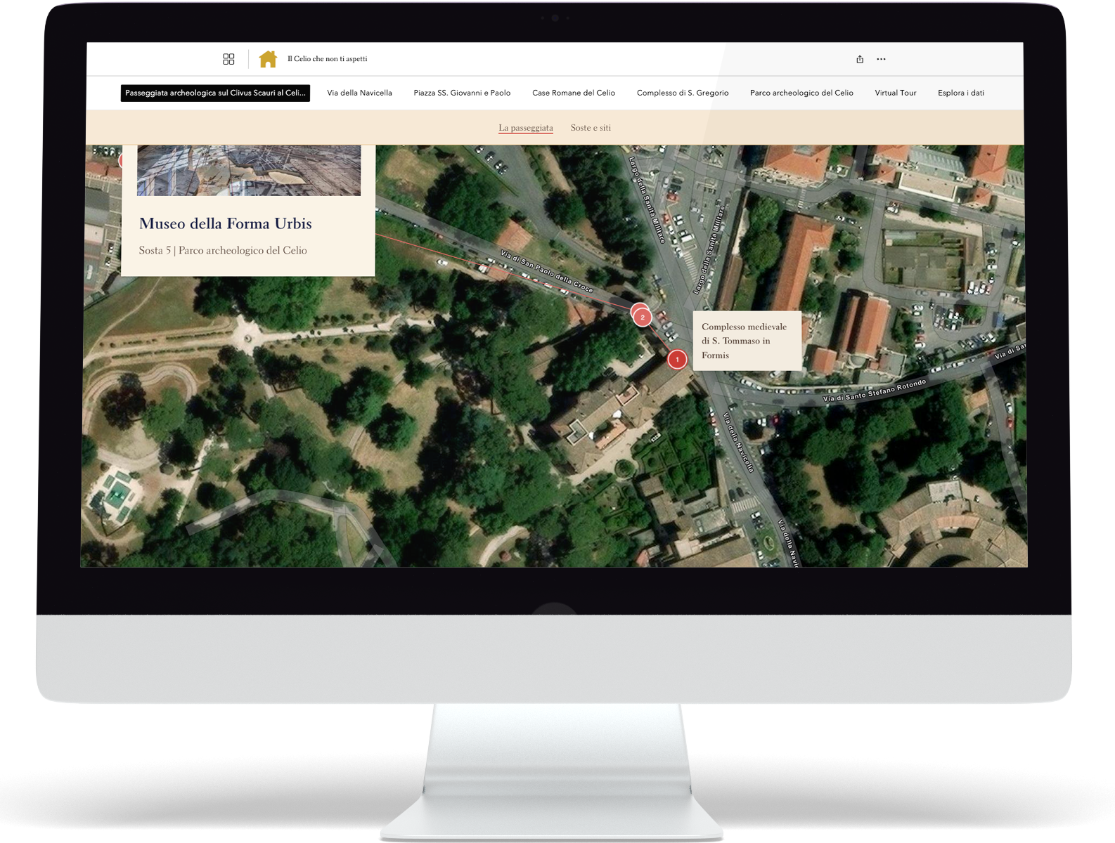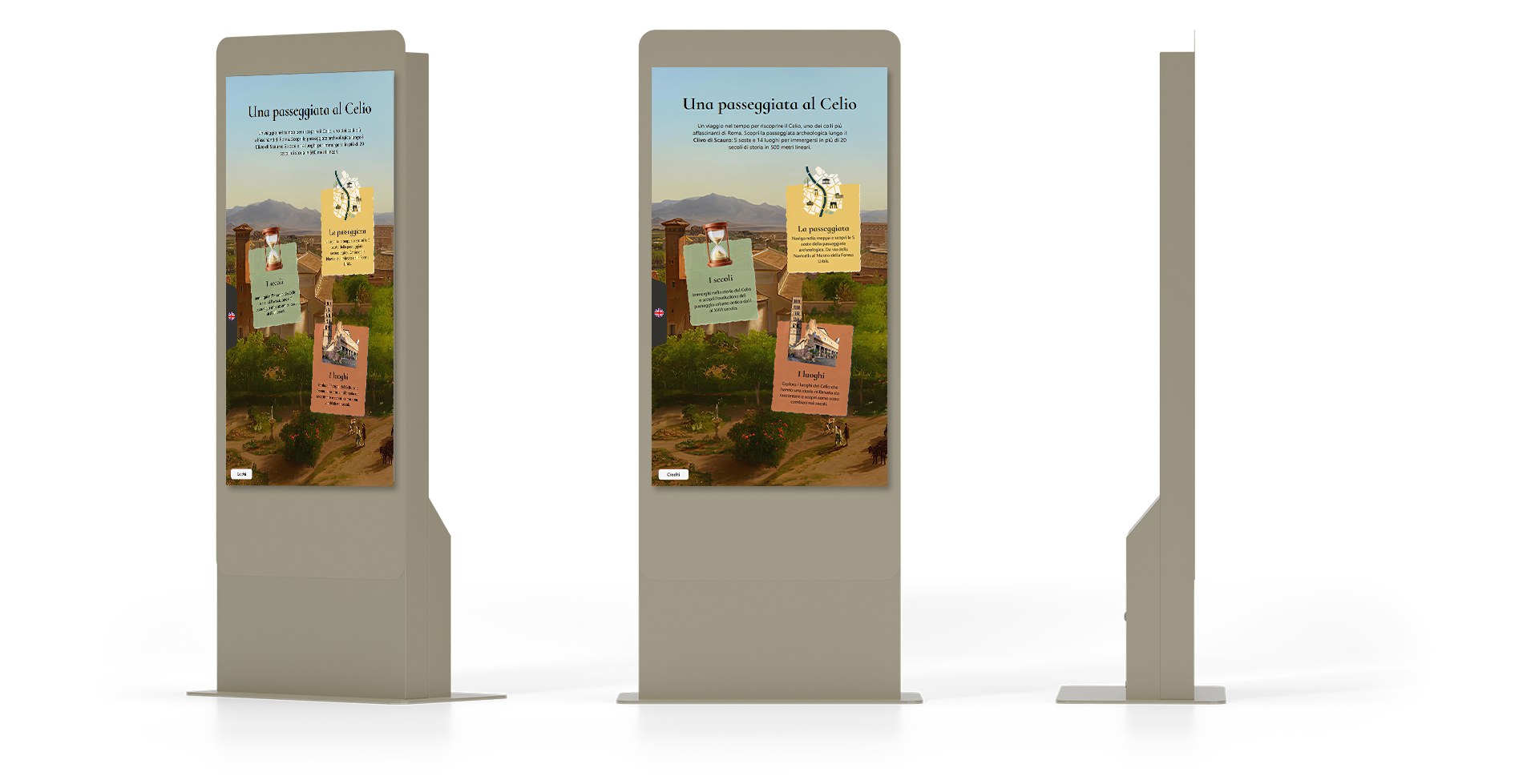 Un totem touch interattivo, posizionato alle Case Romane del Celio, pensato per offrire ai visitatori diverse chiavi di accesso per esplorare il percorso e navigare tra i siti d’interesse attraverso i secoli.